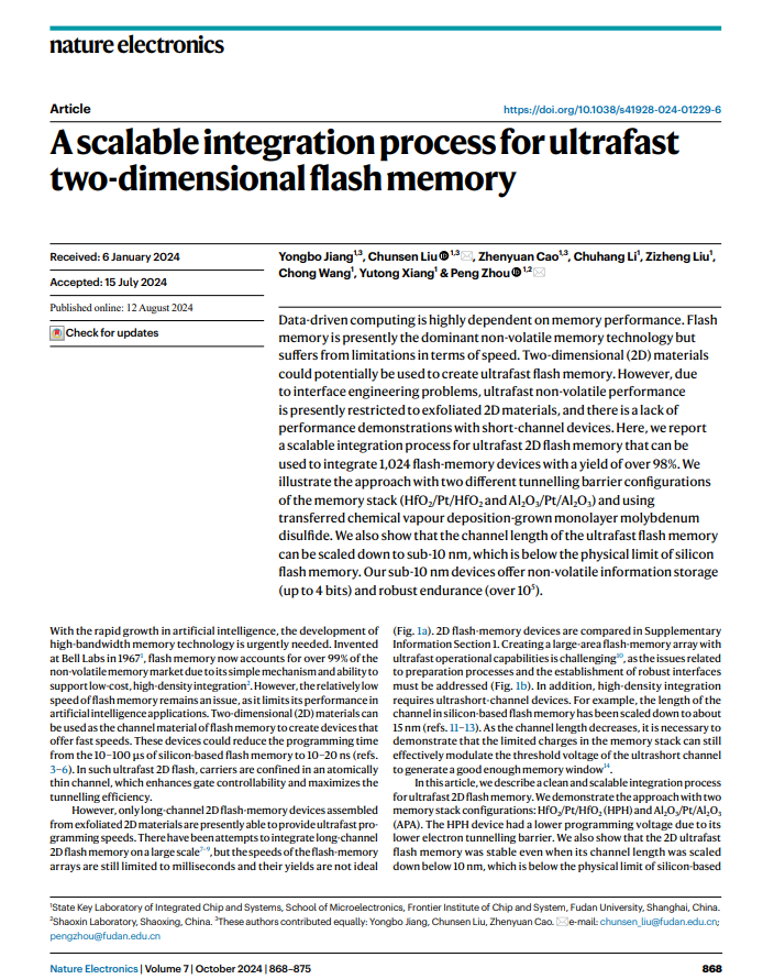 相关研究成果以《全功能二维-硅基混合架构闪存芯片》(A full-featured 2D flash chip enabled by system integration)为题,于北京时间10月8日晚间在《自然》(Nature)期刊上发表。