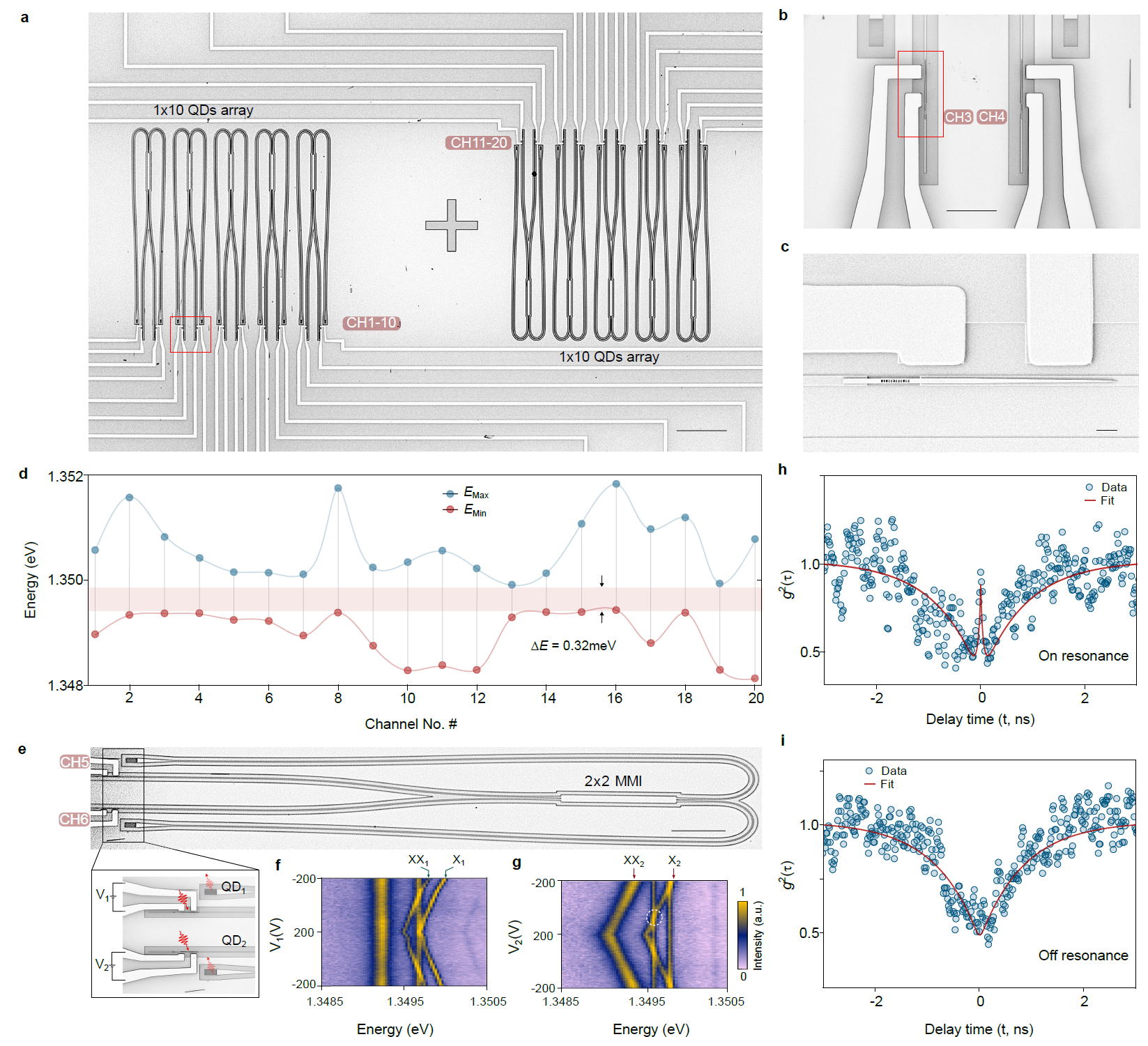 针对上述问题,中国科学院上海微系统与信息技术研究所张加祥、欧欣研究员联合中山大学刘进教授、中国科学技术大学霍永恒教授团队在 Nature Materials 发表了题为 “Large-scale quantum-dot–lithium-niobate hybrid integrated photonic circuits enabling on-chip quantum networking” 的最新研究成果。该团队创新性地实现了基于固态原子(半导体量子点)确定性单光子源与低损耗铌酸锂薄膜的混合集成光量子芯片,并提出基于铌酸锂薄膜铁电畴工程的片上局域应力调控技术,实现了量子点单光子源宽范围、高动态、可逆的光谱精细调谐。同时,团队发展出基于“微转印”工艺的百纳米精度混合集成技术,实现了多达20个确定性量子点单光子源的同步片上集成与光谱调谐。通过材料功能创新与混合芯片架构突破,研究团队首次在混合集成光量子芯片上实现了空间分离的量子点单光子源之间的片上量子干涉互联,为构建可扩展的片上量子网络奠定了重要基础。 大规模半导体量子点-铌酸锂薄膜混合集成光量子芯片 2.研究亮点 (1)结合自组装量子点与铌酸锂这两种在光学研究领域中具有巨大优势的量子材料,针对光量子芯片中多光子态扩展化制备这一长期存在的难题,创新“微转印”混合芯片集成工艺,实现20个量子确定性量子光源与低损耗铌酸锂光子芯片的混合集成,构建了目前国际上基于量子点确定性光源的最大规模混合集成光量子芯片; (2)针对片上固态量子体系(如量子点、金刚石色心等)固有的非均匀展宽问题,提出基于铌酸锂薄膜铁电畴工程的新型直流电压驱动局域应力调控技术,实现五个关键特性集成:芯片集成、宽域调谐、4K低温兼容、超低功耗(mW量级)以及可逆调控,这一方法不仅拓展了铌酸锂材料除电光调制和声表面波之外片上量子调控这一新功能维度,为其它新兴铁电薄膜材料,如钛酸钡(BTO)、钛酸锶(STO)等在片上量子调控应用提供关键技术指导。 3.关键点突破 (1)提出铌酸锂薄膜上应力调控新机制,实现片上应力动态调控量子点确定性单光子源,光谱调谐范围达到7.7 meV,超过量子点单光子变换极限线宽三个数量级; (2)发展出百纳米级精度的“微转印”混合集成工艺,实现多达20个量子点确定性单光子源的片上同时集成和光谱调谐,基于该平台,实现片上不同量子点单光子源的量子干涉互联,片上互联距离0.48 mm,干涉可见度73%; (3)基于铌酸锂铁电畴工程的片上应力调控技术具有4K低温兼容、应力输出温度不敏感、空间局域和超低功耗输出等优异特性,支持千量级量子点光源的同时芯片集成,为片上扩展化多光子资源制备提供重要技术路线。 4.图文解读 图1:(a)大规模半导体量子点-铌酸锂薄膜混合集成光量子芯片。(b)具有局域应力调控功能的混合量子点-铌酸锂集成波导。(c)低温下X-切铌酸锂薄膜直流驱动铁电畴工程实现片上局域应力。(d)铌酸锂薄膜上各项异性局域应力。 图2:(a)不同取向的量子点砷化镓-铌酸锂混合集成波导,单光子信号可通过波导顶部或光栅耦合器输出。(b,c)不同波导取向的片上应力调控。(d)取向角度相关应力张量分布的数值仿真。(e,f)波导取向相关的量子点能带调谐数值仿真。 图3:波导取向相关的量子点局域应力调控范围统计,其中(a)为有二氧化硅绝缘层支撑的量子点/铌酸锂混合波导(b)为无二氧化硅绝缘层支撑的量子点/铌酸锂混合波导。(c)最优化角度(88o)处波导耦合量子点的可逆和大光谱范围调谐结果,调谐范围(d)7.7 meV。(e)局域应力调控量子点时单光子荧光线宽变化。 图4:(a)含20通道量子点确定性单光子源的铌酸锂混合集成光量子芯片。(b, c)量子点-铌酸锂混合集成波导扫描电子显微镜照片。(d)片上20通道量子点确定性光源的同时局域光谱调谐,局域调谐范围0.76 meV/400V, 红色区域为20通道量子光源调谐后的‘同频’区域。(e, f, g)通道5和6中两个不同频量子点的同时局域调控。(h,i)片上两个波导耦合量子点的双光子共振测试。 5.未来展望 该工作结合自组装量子点与铌酸锂这两种在光学研究领域中具有巨大优势的量子材料,为扩展化光量子芯片的发展提供了新的技术路线。同时,平台具有进一步扩展潜力,当前量子点单光子源的片上集成密度可达 67 个/mm, 因此厘米级芯片可容纳 1000+量子通道。此外,单通道量子点单光子源局域应力调控仅需要微瓦功率损耗,相比硅光子芯片中毫瓦功耗的热光调控降低了三个数量级,其低温兼容性和微瓦级功耗,可实现超导纳米线单光子探测器的同时芯片集成。研究团队还表示,未来还可进一步利用铌酸锂材料的高速电光效应,实现片上光子的高速路由与纠缠分发,这一成果为实现容错线性光量子计算与可扩展量子互联网提供了全新技术方案。 论文第一作者为上海微系统所博士王旭东,通讯作者为中国科学技术大学霍永恒教授、中山大学刘进教授、上海微系统所欧欣与张加祥研究员。该研究工作得到了国家重点研发计划(2022YFA1404604)、中国科学院青年团队稳定支持(YSBR-112)和国家自然科学基金等项目的支持。 原文链接:https://www.nature.com/articles/s41563-025-02398-1