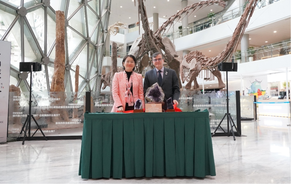 11月7日,乌拉圭紫水晶捐赠仪式于上海自然博物馆(上海科技馆分馆)举行。上海市科学技术委员会副主任黄红、上海科技馆馆长倪闽景,乌拉圭驻华大使阿尼瓦尔·卡夫拉尔(Aníbal Cabral)、乌拉圭驻上海总领事马塞罗·马龙(Marcelo Magnou)、乌拉圭驻华机构相关代表,市科委科普与科技传播处、科技合作处及上海科技馆有关部门负责人出席仪式,与现场观众一同见证三块来自乌拉圭阿蒂加斯省的珍贵紫水晶矿石正式落户上海自然博物馆,成为连接中乌两国的璀璨自然与科普文化的崭新纽带。