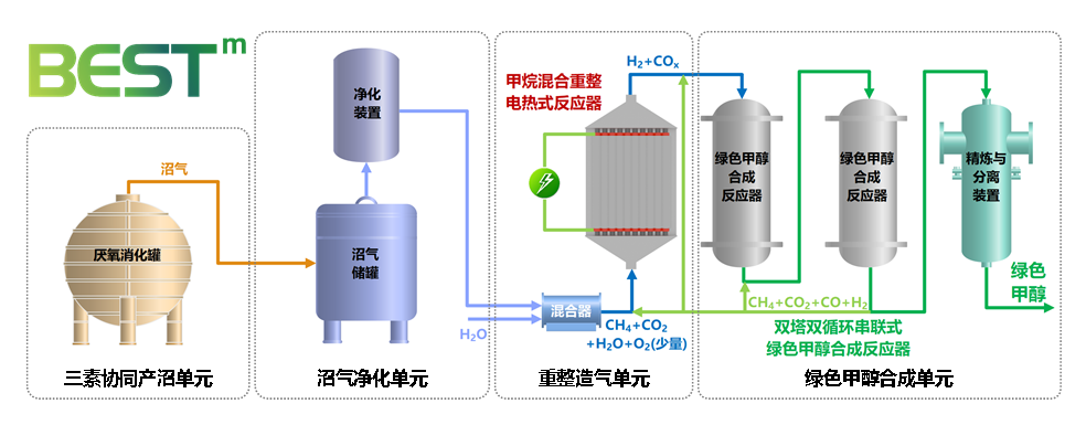 传统思路处理沼气,碳利用效率不高。沼气中约含60%-70%的甲烷和30-40%的二氧化碳,常见做法是耗费能量分离两种组分,只利用其中的甲烷。这一过程不仅额外产生碳排放,30-40%的二氧化碳及其蕴含的“绿碳”资源,也被白白浪费了。而陈德院士团队攻关的BESTm沼气全碳定向转化制绿色甲醇颠覆性技术,则致力于“榨干每一份绿碳”,让每一份碳资源都发挥价值。