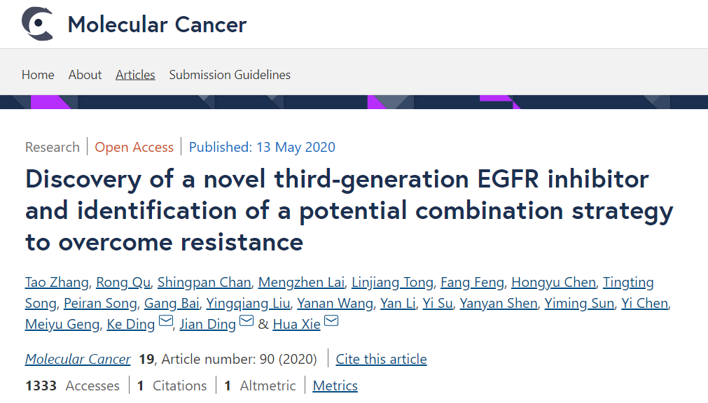 2020年5月13日,中科院上海药物研究所与暨南大学在Molecular Cancer杂志上合作发表了题为Discovery of a novel third-generation EGFR inhibitor and identification of a potential combination strategy to overcome resistance的文章,报道了一种新型EGFR三代抑制剂的抗肿瘤活性,同时发现该类抑制剂的全新耐药机制并找到克服耐药有效策略,为含EGFR突变的非小细胞肺癌(NSCLC)患者的治疗和有效克服耐药提供了新思路。