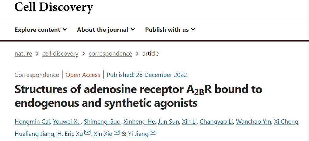 2022年12月28日,中国科学院上海药物研究所徐华强研究员团队和谢欣研究员团队联合临港实验室蒋轶研究员共同在Cell Discovery发表了最新的研究成果“Structures of adenosine receptor A2BR bound to endogenous and synthetic agonists”。研究解析了腺苷受体家族A2BR受体分别结合内源性配体腺苷(ADO)和选择性激动剂小分子(BAY 60-6583)并偶联改造型Gs复合物的冷冻电镜结构,分辨率分别为3.2埃和2.9埃。