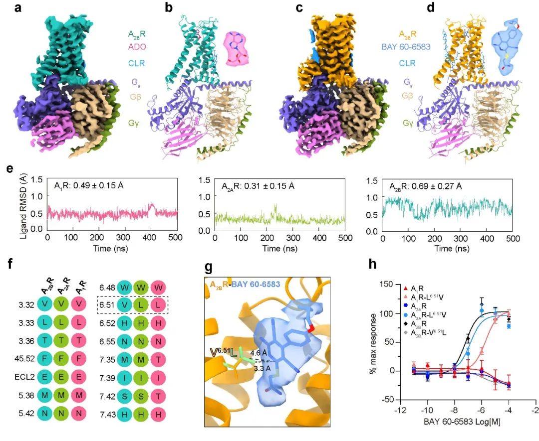 图1:a-b,ADO和BAY 60-6583与A2BR和GS蛋白复合物结构;e,腺苷受体结合腺苷口袋的动力学模拟;f,腺苷受体家族正构口袋氨基酸;g,BAY 60-6583和L6.51之间的潜在空间位阻。h,野生型和突变体ARs在6.51位的亮氨酸/缬氨酸对BAY 60-6583的影响。