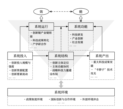 第一,本文指出国家创新体系“效能”是综合性概念,可以从“能”与“效”两个维度对其进行理解。“能”主要表现为国家创新体系系统功能,其由系统结构决定,要求形成各司其职、充分协同的系统结构;“效”主要表现为系统运行效率,通过系统的自组织机制,达到国家创新体系稳定、平衡、有序的运行与发展。这两个维度也进一步通过反馈机制互相影响、协同发展。