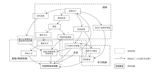 在系统运行层面,直接影响因素是科技人才与科技资金的投入,但投入的水平和发挥也受到多重因素影响。政府作为营造良好创新环境的主要力量,可以通过调控政策因子提高资源投入水平,从而推动科技研发体系效能提升。例如可以通过货币政策与财政政策的调控直接增加科技经费,也可通过增加教育支出等方式提高科技人才投入的数量与水平。此外,政府还可以通过布局创新平台建设等手段促进产学研合作,深化企业、高校、科研院所、中介机构间的联系与互动,拓宽科技经费来源渠道,间接推动科技研发子体系效能提升。科技研发子体系效能对政策措施的选择和调整也具有反馈、调节作用,当科技研发子体系效能表现不佳或表现突出时,又会反过来刺激政府改进完善或进一步强化相应政策举措,从而形成循环的、持续发展的科技研发子体系(如图4所示)。