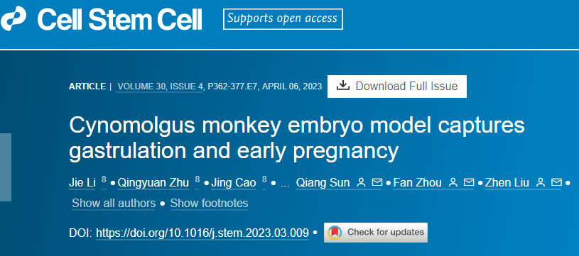4月6日,《Cell Stem Cell》期刊在线发表了题为《食蟹猴胚胎模型体外培养发育到原肠胚和引起早期妊娠反应》的研究论文,该研究由中国科学院脑科学与智能技术卓越创新中心(神经科学研究所)刘真研究组、非人灵长类研究平台孙强研究团队与清华大学生命科学学院周帆研究组合作完成。该研究利用胚胎干细胞建立了食蟹猴类囊胚诱导系统,体外培养食蟹猴类囊胚可诱导原肠运动的相关胚层,体内移植可以检测到早期妊娠囊的出现。