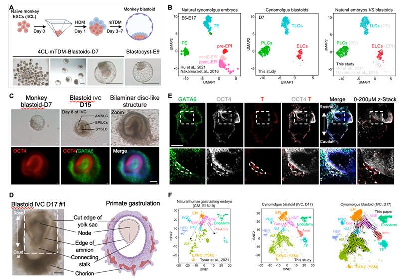 图1.(A)非人灵长类食蟹猴类囊胚体外重构。(B)scRNA-seq分析体外重构的非人灵长类食蟹猴类囊胚的细胞谱系构成。(C)非人灵长类食蟹猴类囊胚体外延迟培养至D15时形成的双层胚盘样结构。(D)非人灵长类食蟹猴类囊胚体外延迟培养至D17时形成的原肠胚样结构。(E)非人灵长类食蟹猴D17类胚胎的形态学染色。OCT4,EPI marker.GATA6,amine marker.T(Brachyury),gastrulation marker.(F)非人灵长类食蟹猴D17类胚胎的单细胞转录组分析和发育路径分析。