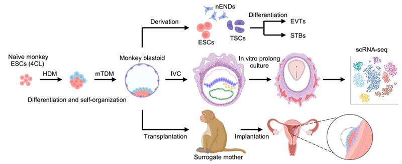 该研究利用胚胎干细胞体外重构了非人灵长类类囊胚,并对其体内外发育潜能进行深入全面的探究和评估,首次将非人灵长类的类囊胚体外培养至着床后原肠胚时期。