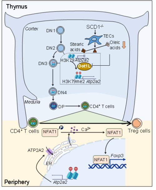 硬脂酰辅酶A去饱和酶(SCD)是催化来源于食物或者从头合成的饱和脂肪酸转变为单不饱和脂肪酸(油酸与棕榈油酸)的限速酶。其中,人类基因组中的2个SCD基因均与小鼠SCD1基因高度同源。研究发现,SCD1缺失显著促进小鼠外周血、淋巴结以及主要组织器官中Foxp3+Treg的数量与比例,并赋予其抵抗自身免疫性疾病的能力,这与SCD1缺失促进初始CD4+T细胞向Treg分化密切相关。研究利用条件性敲除小鼠、骨髓移植、胸腺移植和T细胞体外发育等体系发现,SCD1在胸腺上皮细胞中的缺失是导致初始CD4+T细胞向Treg的分化倾向性增加的主要原因,而非SCD1在T细胞中缺失所致。更重要的是,胸腺上皮细胞油酸的可利用性影响初始CD4+T细胞向Treg分化潜能的关键窗口期是胸腺细胞DN2向DN3的发育阶段。在油酸缺乏的胸腺微环境中,胸腺细胞内表观遗传修饰酶DOT1L活性上调,借以H3K79me2修饰促进DN3胸腺细胞中Atp2a2基因座的染色质开放水平。这一表观遗传学印记从DN3阶段一直保留至初始CD4+T细胞,使其在接受T细胞受体激活信号时,通过ATP2A2-calcium-NFAT-Foxp3信号轴促进其向Treg分化。该研究揭示了胸腺基质微环境中的油酸信号影响和预编程外周T细胞亚群分化偏好性的细胞与分子机制。这为探究不同生理病理环境中T细胞免疫调控机制提供了新视角,并为Treg的定向高效诱导及其在器官移植、自身免疫性疾病等治疗中的应用提供了新策略与新方向。