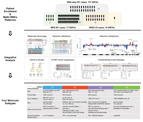原发于间叶组织的恶性肿瘤统称为肉瘤,肉瘤有至少70种病理类型。尽管胃肠间质瘤(GIST)是最常见的肉瘤,癌症基因组图谱(TCGA)肉瘤专项并没有包含GIST。临床上GIST恶性程度差异大,如有的小GIST呈“惰性”,长期不会进展,而有的GIST进展快,易转移。前期GIST遗传学研究已经鉴定出一些驱动基因,如DMD、DEPDC5、MAX和SETD2等,但是GIST系统性的基因组和转录组图谱尚无报道。 研究纳入了通过DNA/RNA、病理和二代测序质控的来自105位患者的117例GIST,发现GIST肿瘤突变负荷低,但存在广泛的拷贝数变异,并且随着恶性程度增高,遗传学变异增加。染色体碎裂(chromothripsis)和突变阵雨(kataegis)等复杂遗传学变异富集于原发高危和转移GIST。研究进一步鉴定出新型抑癌基因YLPM1, 并证明YLPM1失活通过增强氧化磷酸化促进GIST生长和进展。利用来自同一病人不同转移灶和原发/转移配对肿瘤,证明转移GIST具有复杂的遗传学异质性。最后,作者整合转录组、基因组和拷贝数组数据提出了新的分子分型,四种分子亚型具有不同的基因组、表达谱、免疫学以及临床特性,提出并验证了亚型特异性治疗策略,指出C1亚型单纯手术切除病人即可长期获益,C2亚型(小肠间质瘤)而不是C3亚型(胃间质瘤)有望获益于免疫治疗,C3亚型(免疫荒漠型)适合KIT抑制剂和CDK4/6抑制剂的联合治疗,C4亚型将获益于PDGFRA的分子靶向治疗。 图1:胃肠间质瘤基因组和转录组图谱,新型分子分型及干预策略 中国科学院上海营养与健康研究所博士毕业生谢飞飞、芦晓晶和刘晓筱,华大基因智惠医学研究院罗淑贞、刘栋兵,上海交通大学附属仁济医院汪明为该论文的共同第一作者,王跃祥、吴逵、曹晖和王思敏为论文的共同通讯作者,该工作还受到上海交通大学附属仁济医院病理科沈艳莹博士、汤道强博士,中国科学院上海营养与健康研究所黄涛研究员、嘉兴第一医院何屹教授和河南科技大学李可博士的支持和帮助。此项成果得到了国家自然科学基金、科技部重点研发计划专项、上海市科委重点项目和国家资助博士后计划的支持,也得到了营养与健康所所级公共技术中心分析测试技术平台、实验动物技术平台的支持。