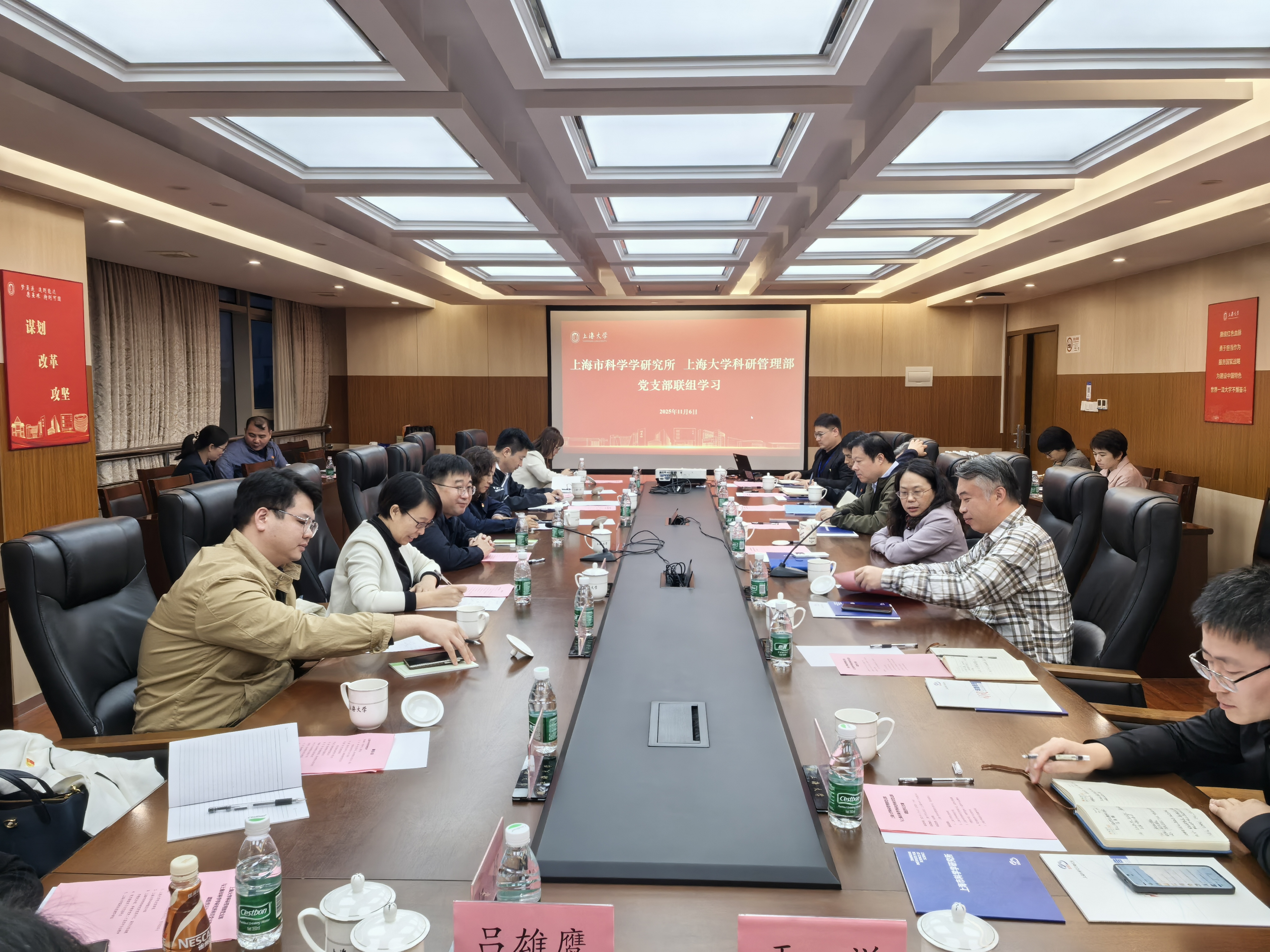 2025年11月6日,上海市科学学研究所第一、第四党支部赴上海大学宝山校区,与上海大学科研管理部党支部围绕深入学习贯彻党的二十届四中全会精神开展联组学习。科学学所党委书记、副所长陈海鹏和上海大学副校长张建华出席此次联组学习,会议由上海大学科研管理部党支部书记、常务副部长张新鹏主持。
