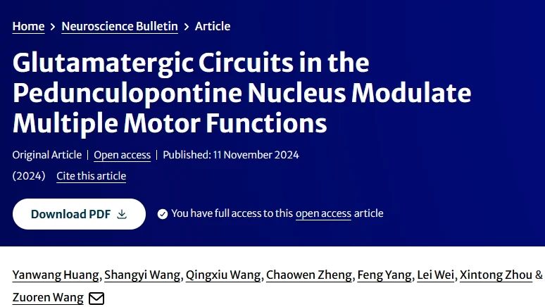 2024年11月11日,《Neuroscience Bulletin》期刊在线发表题为《脚桥核谷氨酸环路调控多种运动功能》的研究论文,该研究由中国科学院脑科学与智能技术卓越创新中心王佐仁研究组完成。该研究阐明了脚桥核谷氨酸能神经元调控多种运动功能的神经环路机制,为深入理解大脑调控运动提供了重要基础。