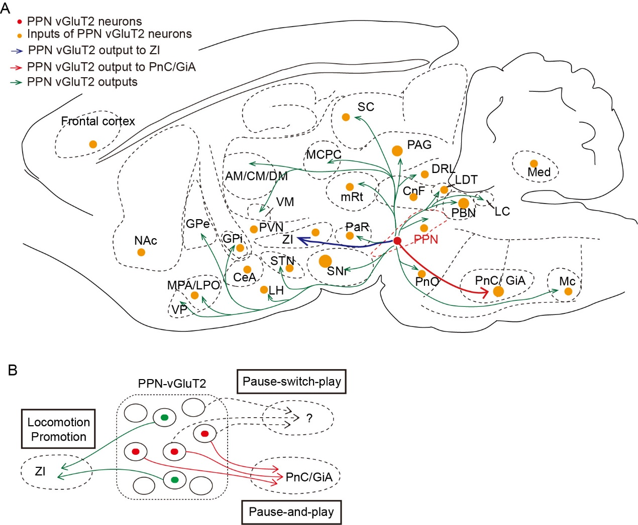 脚桥核(PPN)被认为是运动调控的重要脑区,然而,PPN中谷氨酸能(vGluT2)神经元对运动控制的贡献在临床和基础研究中仍存在争议。在临床上,PPN是帕金森病患者深部脑刺激(DBS)的潜在靶点,尤其适用于那些对多巴胺能治疗和丘脑底核/苍白球内侧(STN/GPi)DBS已无反应的患者。尽管个体间反应差异较大,对病例研究的综合回顾表明,PPN-DBS可能改善平衡并减少跌倒的发生率。但,PPN-DBS治疗帕金森病患者的确切机制仍未可知。基础研究中,近期一些高影响力的研究进一步探讨了中脑运动区(MLR)/PPN-vGluT2的功能作用。然而,PPN中谷氨酸能(vGluT2)神经元对运动控制的环路机制仍不清楚。 研究团队发现,喙侧PPN-vGluT2神经元对显著的环境刺激有强烈反应,其激活会立即导致运动停止,但保持现有的姿势控制。此外,研究团队还发现了吻侧PPN-vGluT2神经元活动与运动和同侧转头行为之间的相关性,并进一步描绘了由这些神经元发出的两条关键下游通路:一条投射至尾侧脑桥网状核/前巨细胞网状核(PnC/GiA),起到抑制运动的作用,与“暂停-播放”行为模式相吻合;另一条投射至不定带区(ZI),有助于促进运动。此外,研究团队还发现吻侧PPN-vGluT2神经元的整体激活呈现出一种新的“暂停-切换-播放”运动调节模式。这些发现共同揭示了PPN在运动功能中的复杂作用,并为理解其生理功能及潜在治疗价值提供了综合的理论基础。 脑智卓越中心王佐仁研究员为该论文的通讯作者,博士后黄延旺和博士研究生王上一为该论文的共同第一作者,王清秀、郑超文、杨锋、魏磊和周昕童等也做出了重要贡献。该研究得到了国家科技创新2030—“脑科学与类脑研究”重大项目的支持。