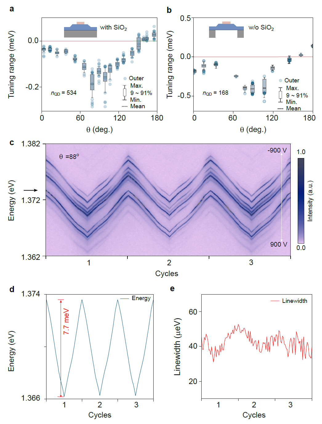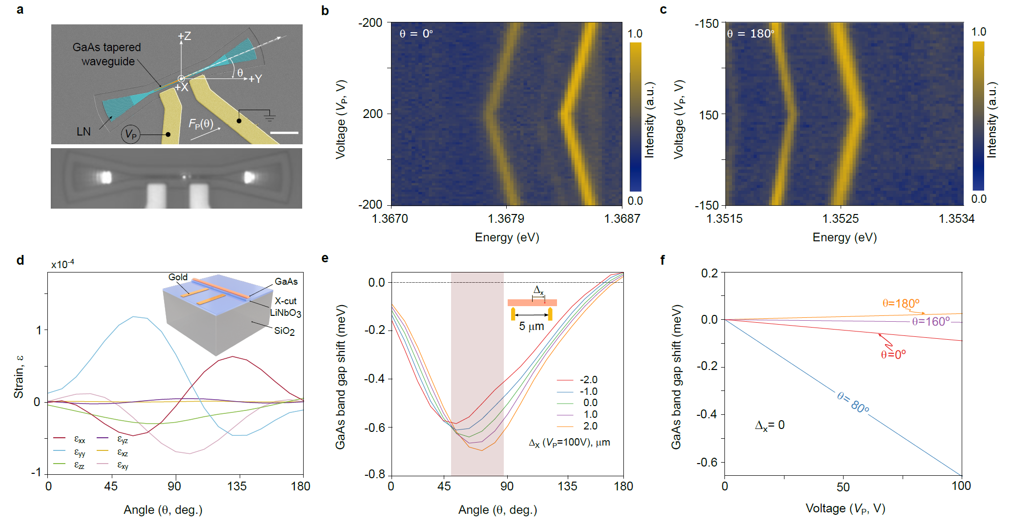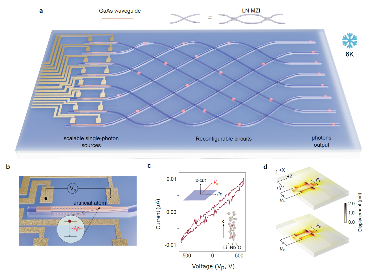 针对上述问题,中国科学院上海微系统与信息技术研究所张加祥、欧欣研究员联合中山大学刘进教授、中国科学技术大学霍永恒教授团队在 Nature Materials 发表了题为 “Large-scale quantum-dot–lithium-niobate hybrid integrated photonic circuits enabling on-chip quantum networking” 的最新研究成果。该团队创新性地实现了基于固态原子(半导体量子点)确定性单光子源与低损耗铌酸锂薄膜的混合集成光量子芯片,并提出基于铌酸锂薄膜铁电畴工程的片上局域应力调控技术,实现了量子点单光子源宽范围、高动态、可逆的光谱精细调谐。同时,团队发展出基于“微转印”工艺的百纳米精度混合集成技术,实现了多达20个确定性量子点单光子源的同步片上集成与光谱调谐。通过材料功能创新与混合芯片架构突破,研究团队首次在混合集成光量子芯片上实现了空间分离的量子点单光子源之间的片上量子干涉互联,为构建可扩展的片上量子网络奠定了重要基础。 大规模半导体量子点-铌酸锂薄膜混合集成光量子芯片 2.研究亮点 (1)结合自组装量子点与铌酸锂这两种在光学研究领域中具有巨大优势的量子材料,针对光量子芯片中多光子态扩展化制备这一长期存在的难题,创新“微转印”混合芯片集成工艺,实现20个量子确定性量子光源与低损耗铌酸锂光子芯片的混合集成,构建了目前国际上基于量子点确定性光源的最大规模混合集成光量子芯片; (2)针对片上固态量子体系(如量子点、金刚石色心等)固有的非均匀展宽问题,提出基于铌酸锂薄膜铁电畴工程的新型直流电压驱动局域应力调控技术,实现五个关键特性集成:芯片集成、宽域调谐、4K低温兼容、超低功耗(mW量级)以及可逆调控,这一方法不仅拓展了铌酸锂材料除电光调制和声表面波之外片上量子调控这一新功能维度,为其它新兴铁电薄膜材料,如钛酸钡(BTO)、钛酸锶(STO)等在片上量子调控应用提供关键技术指导。 3.关键点突破 (1)提出铌酸锂薄膜上应力调控新机制,实现片上应力动态调控量子点确定性单光子源,光谱调谐范围达到7.7 meV,超过量子点单光子变换极限线宽三个数量级; (2)发展出百纳米级精度的“微转印”混合集成工艺,实现多达20个量子点确定性单光子源的片上同时集成和光谱调谐,基于该平台,实现片上不同量子点单光子源的量子干涉互联,片上互联距离0.48 mm,干涉可见度73%; (3)基于铌酸锂铁电畴工程的片上应力调控技术具有4K低温兼容、应力输出温度不敏感、空间局域和超低功耗输出等优异特性,支持千量级量子点光源的同时芯片集成,为片上扩展化多光子资源制备提供重要技术路线。 4.图文解读 图1:(a)大规模半导体量子点-铌酸锂薄膜混合集成光量子芯片。(b)具有局域应力调控功能的混合量子点-铌酸锂集成波导。(c)低温下X-切铌酸锂薄膜直流驱动铁电畴工程实现片上局域应力。(d)铌酸锂薄膜上各项异性局域应力。 图2:(a)不同取向的量子点砷化镓-铌酸锂混合集成波导,单光子信号可通过波导顶部或光栅耦合器输出。(b,c)不同波导取向的片上应力调控。(d)取向角度相关应力张量分布的数值仿真。(e,f)波导取向相关的量子点能带调谐数值仿真。 图3:波导取向相关的量子点局域应力调控范围统计,其中(a)为有二氧化硅绝缘层支撑的量子点/铌酸锂混合波导(b)为无二氧化硅绝缘层支撑的量子点/铌酸锂混合波导。(c)最优化角度(88o)处波导耦合量子点的可逆和大光谱范围调谐结果,调谐范围(d)7.7 meV。(e)局域应力调控量子点时单光子荧光线宽变化。 图4:(a)含20通道量子点确定性单光子源的铌酸锂混合集成光量子芯片。(b, c)量子点-铌酸锂混合集成波导扫描电子显微镜照片。(d)片上20通道量子点确定性光源的同时局域光谱调谐,局域调谐范围0.76 meV/400V, 红色区域为20通道量子光源调谐后的‘同频’区域。(e, f, g)通道5和6中两个不同频量子点的同时局域调控。(h,i)片上两个波导耦合量子点的双光子共振测试。 5.未来展望 该工作结合自组装量子点与铌酸锂这两种在光学研究领域中具有巨大优势的量子材料,为扩展化光量子芯片的发展提供了新的技术路线。同时,平台具有进一步扩展潜力,当前量子点单光子源的片上集成密度可达 67 个/mm, 因此厘米级芯片可容纳 1000+量子通道。此外,单通道量子点单光子源局域应力调控仅需要微瓦功率损耗,相比硅光子芯片中毫瓦功耗的热光调控降低了三个数量级,其低温兼容性和微瓦级功耗,可实现超导纳米线单光子探测器的同时芯片集成。研究团队还表示,未来还可进一步利用铌酸锂材料的高速电光效应,实现片上光子的高速路由与纠缠分发,这一成果为实现容错线性光量子计算与可扩展量子互联网提供了全新技术方案。 论文第一作者为上海微系统所博士王旭东,通讯作者为中国科学技术大学霍永恒教授、中山大学刘进教授、上海微系统所欧欣与张加祥研究员。该研究工作得到了国家重点研发计划(2022YFA1404604)、中国科学院青年团队稳定支持(YSBR-112)和国家自然科学基金等项目的支持。 原文链接:https://www.nature.com/articles/s41563-025-02398-1