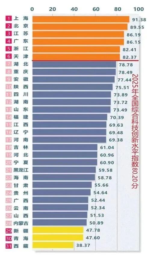用第五名投入获第一名产出 中国科学技术发展战略研究院介绍,《中国区域科技创新评价报告》基于科技部、国家统计局、国家外汇管理局等政府部门的统计数据,对全国31个省区市(不包含港澳台)的综合科技创新水平进行客观评价。报告评价结果已被多地纳入科技发展五年规划目标指标,构建了目前国内持续时间最长、最为稳定的区域创新能力评价体系。 在2025年报告中,位居榜首的上海得分为91.38,位次较上年提升1位,同比提高2.18个百分点。排名第二至第五的依次是北京、江苏、广东、浙江。 在科技活动产出方面,上海得分排名全国第一,创新产出水平和技术成果转化二级维度也均为第一。与上年相比,上海技术国际收入增长8.94%,占全国的34.22%,万元GDP技术国际收入增加2.07美元,保持在全国第一位;万人科技论文数、万人有效注册商标数、万人高价值发明专利拥有量、亿元GDP知识产权使用费出口额均保持全国第二位;技术市场输出技术成交额增长19.93%,万人输出技术成交额增加2891.97万元,位次上升至全国第二。 生物医药产业的BD(商务拓展)收入,是一类重要的技术国际收入。医药魔方的统计数据显示,2025年,中国创新药BD对外授权交易总金额达到1356.55亿美元,首付款70亿美元,交易总量为157笔。在交易数量上,上海位居榜首,占全国交易总量的1/3左右。 科技论文的质量和人均数量,上海也占有优势。2025年,上海科学家在《科学》《自然》《细胞》三大国际顶刊发表论文181篇,占全国的30.6%,较2024年增长14.6%。其中,上海科学家为第一作者或通讯作者的论文有109篇,占全国的24.1%,较2024年增长29.8%。 “值得注意的是,在科技创新投入这个指标上,上海排名全国第五,而在科技创新产出这个指标上排名第一,显示出上海科技创新组织的效率很高,支撑全链条创新的科技服务业发展快速,服务创新产出的生态优势明显。”上海市科学学研究所统计评价研究室主任张宓之说。 2025年全国各省区市综合科技创新水平指数(来源:《中国区域科技创新评价报告2025》) 高新技术产业效益大幅跃升 在创新人力资源方面,上海得分为100,位列全国第一。与上年相比,万人大专以上学历人数、万人R&D(科学研究与试验发展)研究人员数、基础研究人员投入强度指数均保持在全国第二;高校在校学生数增长5.30%,万人高校在校学生数增加17.20人,位次上升2位。 在创新物质条件方面,上海得分排名全国第二。与上年相比,仪器和设备支出增长40.82%,每名R&D人员仪器和设备支出增加1.06万元,位次上升4位;高技术产业固定资产净额占工业固定资产净额比重提高6.63个百分点,位次保持全国第一。 在高新技术产业效益方面,上海排名全国第三,比上年位次跃升13位。与上年相比,知识密集型服务业劳动生产率提高了8.41万元/人,知识产权密集型产业劳动生产率提高了11.13万元/人,工业战略性新兴产业劳动生产率提高了4.53万元/人。 上海高新技术产业的长足进步,表现在很多方面。“十四五”时期,上海全力推动集成电路、生物医药、人工智能三大先导产业的关键核心技术攻关。2024年,三大先导产业规模达到1.8万亿元,年均增速13.1%。为加快前沿技术和未来产业培育,市科委近年来探索建立项目经理人机制,围绕脑机接口、6G、量子计算等未来产业领域,实施项目、资金、人才、平台、政策一体化布局。去年10月,上海出台《关于加快推动前沿技术创新与未来产业培育的若干措施》,围绕未来制造、未来信息、未来材料、未来能源、未来空间、未来健康六大方向,构建“四位一体”工作机制,将创新成果从实验室推向产业应用。 两院院士和媒体负责人评选的2025年国内、国际十大科技新闻中,上海两家企业榜上有名,也体现了上海高新技术产业的创新实力:阶梯医疗与中国科学院脑科学与智能技术卓越创新中心、复旦大学附属华山医院合作,成功开展了国内首例侵入式脑机接口前瞻性临床试验,使我国成为继美国之后,全球第二个将侵入式脑机接口技术推向临床试验的国家;曦智科技研发的光电混合计算加速卡PACE登上《自然》,这是一款集成16000多个光子元件的大型光子加速器,能在极低时延下完成复杂计算任务,展现了光子计算在真实场景中的可行性与高效性。在脑机接口、光子计算等前沿技术和未来产业领域,上海企业走在了世界前列。