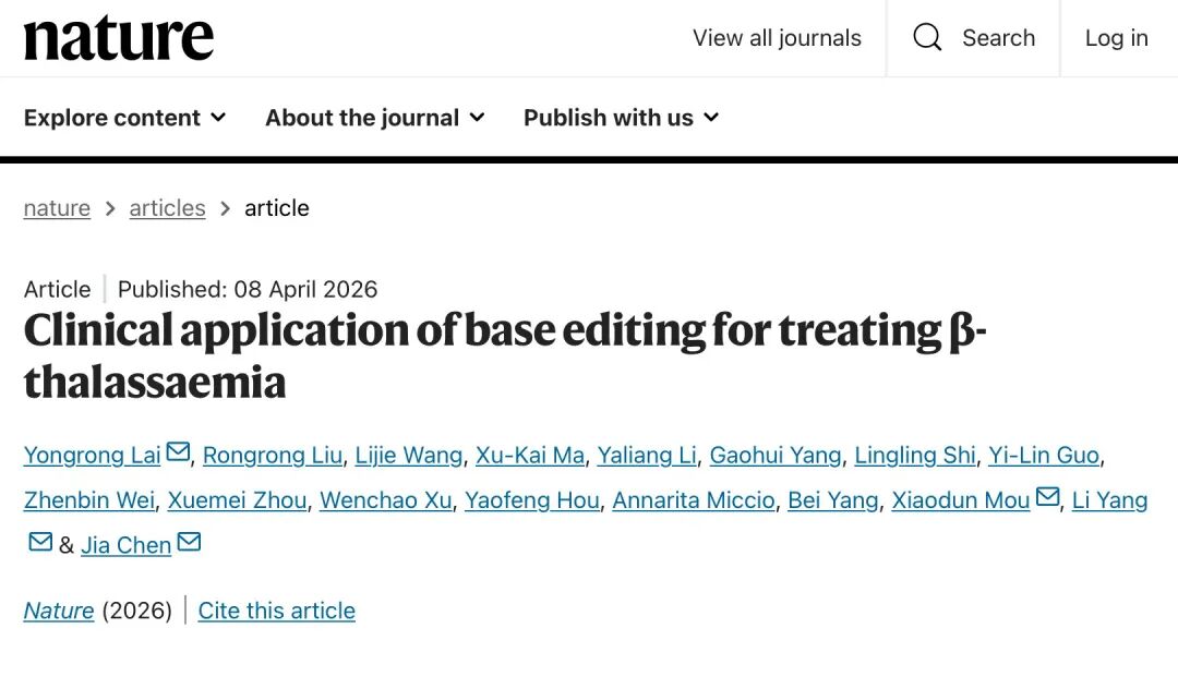 4月8日,国际学术期刊《自然》(Nature)在线发表了一项由上海科技大学、广西医科大学第一附属医院、复旦大学、上海临床研究中心和正序生物合作完成的重磅临床研究成果:利用变形式碱基编辑器tBE(transformer Base Editor)开发的碱基编辑药物CS-101注射液在治疗β-地中海贫血的由研究者发起的临床试验中取得突破性成功,所有接受治疗的输血依赖型患者均在短期内摆脱输血,重获健康造血能力。 这是全球首个发表于《自然》主刊的碱基编辑药物临床研究,标志着中国在基因编辑治疗这一尖端领域的源头创新与临床转化已走在世界前列。截至目前,CS-101正在全力推进IND临床试验,成功治愈近20名海内外β-地中海贫血和镰刀型细胞贫血病患者,所有接受治疗的患者100%治愈,迅速摆脱输血依赖并长期维持血红蛋白高水平表达。CS-101注射液有望成为全球首个获批上市的碱基编辑药物,以更安全高效的治疗效果、更高性价比的产品优势,让中国原创基因编辑技术惠及全球患者和家庭。 弃“刀”用“笔”,在DNA上做一场无创微雕 目前,输血依赖型β-地中海贫血的传统治疗手段为定期输血,面临铁过载、感染等风险,而造血干细胞移植又受限于配型难与排异风险,无法惠及广大患者。 “我们通过‘化刀为笔’,来实现地贫的功能性治愈。”正序生物创始人、上海科技大学生命学院基因编辑中心主任陈佳介绍,这种疗法是利用“变形式碱基编辑器”作为底层工具,在体外对患者的造血干细胞进行精准的基因编辑。 “基因修正”具体怎么做到的呢?如果将基因比作“生命之书”中的单词,碱基就如同单词中的字母。常规的基因编辑技术(如CRISPR-Cas9)就像一把“分子剪刀”,它通过切断DNA双链来破坏或替换错误基因。但“一刀切断”极易引发染色体大片段缺失或重排等灾难性后果,存在不可控的安全隐患。 研究团队经过多年深入研究,建立了一套全新的技术体系:不再使用“剪刀”硬性切断,通过碱基编辑技术这支“笔”将错误的“字母”修改正确。这一新“工具”优势明显:无需切断DNA双链,直接将出错的特定碱基精准修改,从根本上避免了传统方法可能带来的脱靶和突变累积风险,极大提升了基因编辑的安全底线。利用这项全球领先的技术,团队成功开发了可用于治愈β-地中海贫血的CS-101注射液。 “产品导向、临床应用”,全链条生态加速全球首创 底层技术的安全性,在临床上直接转化为患者优异的“恢复速度”。“此次的临床病例报告了5名输血依赖型β-地贫患者接受体外碱基编辑治疗的情况,其中首位患者已持续摆脱输血依赖超过28个月,展现了惊人的持久疗效,CS-101是目前全球首个且唯一在治疗后有两年以上长期观察数据的碱基编辑药物。”正序生物CEO牟晓盾介绍。 其中,CS-101注射液在中性粒细胞和血小板植入的指标上,患者迅速完成造血重建,更快达到健康人血红蛋白水平。陈佳说道,“我们的中性粒细胞植入时间,差不多是国外分子剪刀型产品的一半。患者能更快地产生白细胞,尽早脱离高感染风险的隔离期。”截至2025年11月,论文中报告的5例患者,平均仅用16天便彻底摆脱了输血依赖。中性粒细胞和血小板植入的中位时间分别为16天和25天;治疗后3个月,总血红蛋白浓度均值在接近健康人水平的12.4 g/dL,胎儿血红蛋白浓度均值也达到11.5 g/dL,均远超国际治愈标准(总血红蛋白浓度9 g/dl)。 临床研究表明,基于tBE开发的碱基编辑疗法CS-101注射液展现了出色的疗效、安全性及持久性,效果优于其他基因治疗产品,具有显著的临床应用价值,并具备成为治疗β-血红蛋白病全球“同类最优”(Best-in-Class)基因编辑药物的潜力。国际审稿人对此也给予高度评价,认为该临床结果为体外编辑造血干细胞治疗设定了全球“新高水位”(new high-water mark)。 “我们团队一开始就直接对标全球成药的最高标准和合规原则,而不是停留在纯研究导向。”陈佳回忆道,这项从基础研究到技术创新再到临床转化的全链条创新,正是源于上海科技大学对科研转化的包容与支持。“从创业第一天起,学校的技术转移办公室就给了我们很多指导,帮我们打通了产学研的脉络。”作为上海科技大学孵化的创新生物医药科技企业,正序生物承接了这项全球独家许可的技术。 从发现底层机制,到靶点筛选,再到登上《自然》并治愈近20位患者,在牟晓盾看来,这种快速的转化,得益于上海成熟的生物医药生态。上海不仅拥有技术策源的土壤,更具备完备的产业链。“我们这个全球首创的技术完全源自上海。同时,我们的临床、生产、转化研发也都是在上海进行的,可以找到全产业链的支持。”优质的高校、医院和上下游公司聚集于此,“我们可以在上海找到每一个拼图最优的解决方案。” 除了地贫,碱基编辑疗法还在拓展其他疾病方向。牟晓盾透露,下一步的重点是高血脂相关疾病,包括遗传性和与衰老相关的非高密度胆固醇累积。这类疾病涉及全球上千万患者,目前尚无特效药。从罕见病到常见病、慢性病,中国原创的碱基编辑技术正在打开更广阔的想象空间。